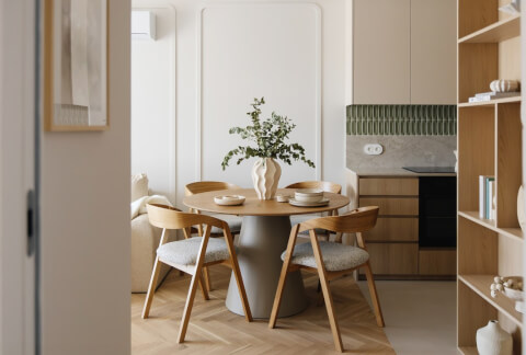 Żaden mebel w projekcie nie jest osobnym bytem – skomponowane są tak, by tworzyć spójną, harmonijną całość i podkreślać nieskrępowaną radość, ubraną jednak w spójne, wręcz organiczne ramy narzucone niejako przez wytyczne stylu Japandi.